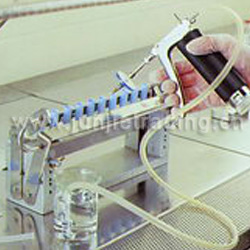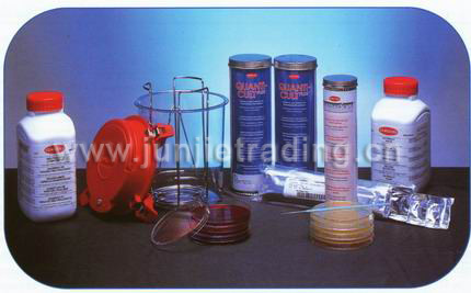| 用棉签擦拭需监测物体表面后,放入相应试剂中(有检测不同菌群的多种试剂可供)在37℃培养。如试剂变色则表明存在相应细菌污染 |